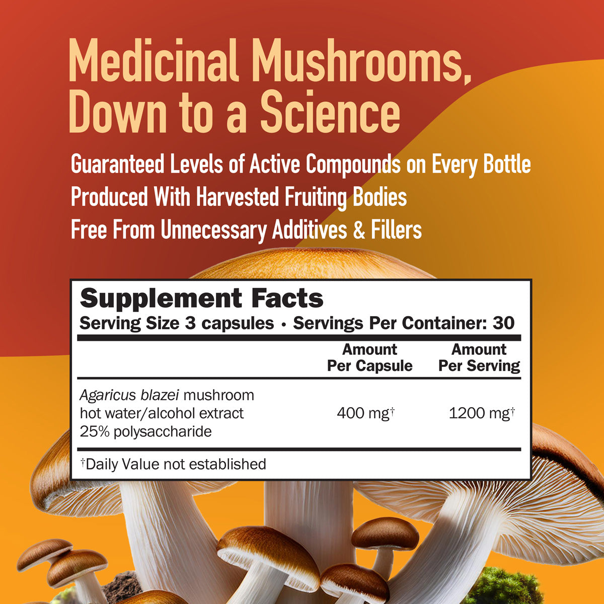 Known in Brazil as the “Mushroom of the Gods,” Agaricus blazei is a rich source of immune-supporting beta glucans, including a unique beta 1-6 glucan not commonly found in other medicinal mushrooms. Traditionally consumed as a tea and now studied for its powerful ability to assist the immune system, Agaricus blazei is a valuable choice for daily cellular and immune support.*