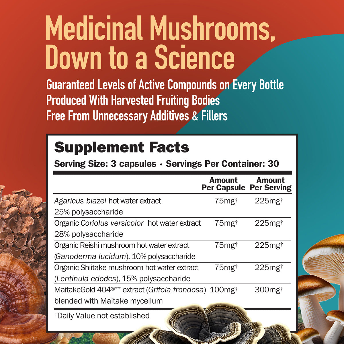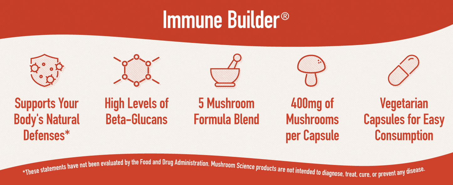 Immune Builder is a daily-use, full extract formula designed to support and strengthen immune function with a concentrated blend of five functional mushrooms. Featuring the clinically researched MaitakeGold 404® along with hot-water extracts of Reishi, Shiitake, Coriolus, and Agaricus blazei, this synergistic formula delivers a wide spectrum of beta glucans to activate and balance the body’s natural defenses.*